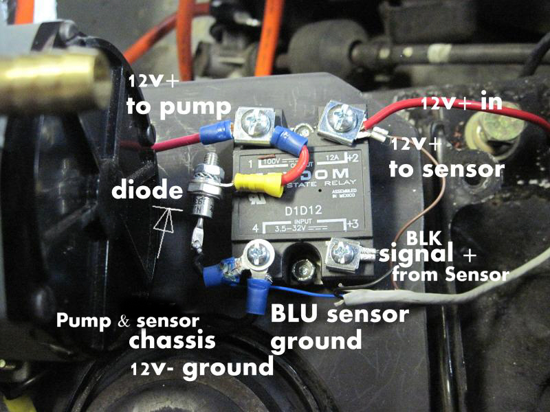 | this is the wiring of the SSR (instead of mechanical contactor in big ol' square D pressure switch). I couldn't use a cheap auto relay because the pressure sensor doesn't send enough of a signal (80 mA max) to close the typical relay which requires 200mA or more. |